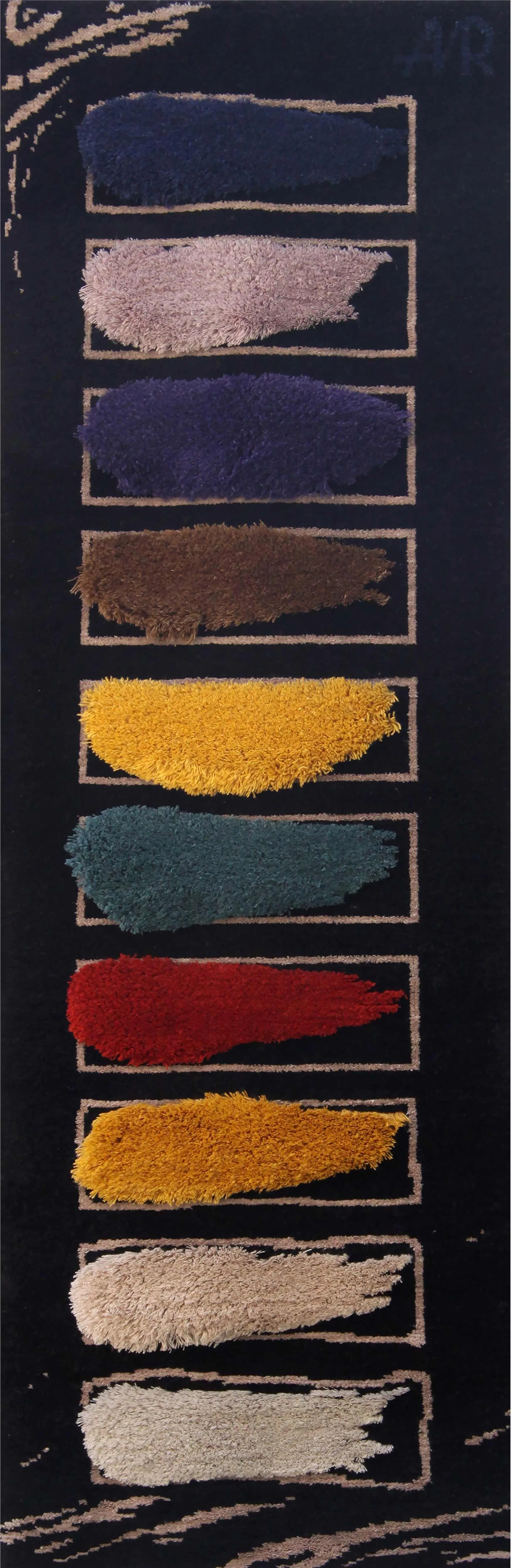 Hautte lisse tapestry with handmade wool knots. I used three-dimensional expressive stylizations. It is the game of shapes and patches of colour with visible graphic solutions and chromatics. The images are of symmetrical and repeating brush strokes. The tapestry has various primary colors, warm and cool, red, white, yellow, blue and coloured greys contrasting with the dark background.