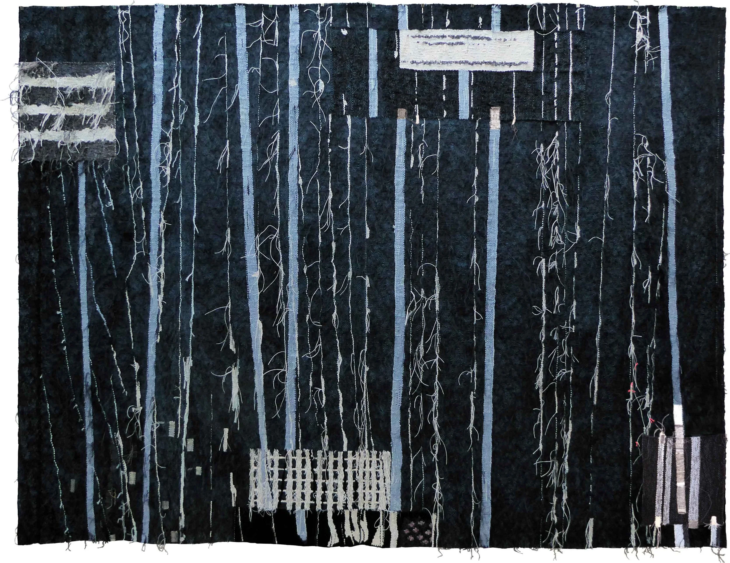 “Interdiction” - Dense and translucent areas of weaving where the blue warp is exposed, create depth of field and amplify structure. Ends finished to the front enrich the surface and reflect gesture, mark and movement. In this panorama, converging and diverging vertical lines represent the status quo of everyday life. Suddenly, this continuum has been halted by four intruders.