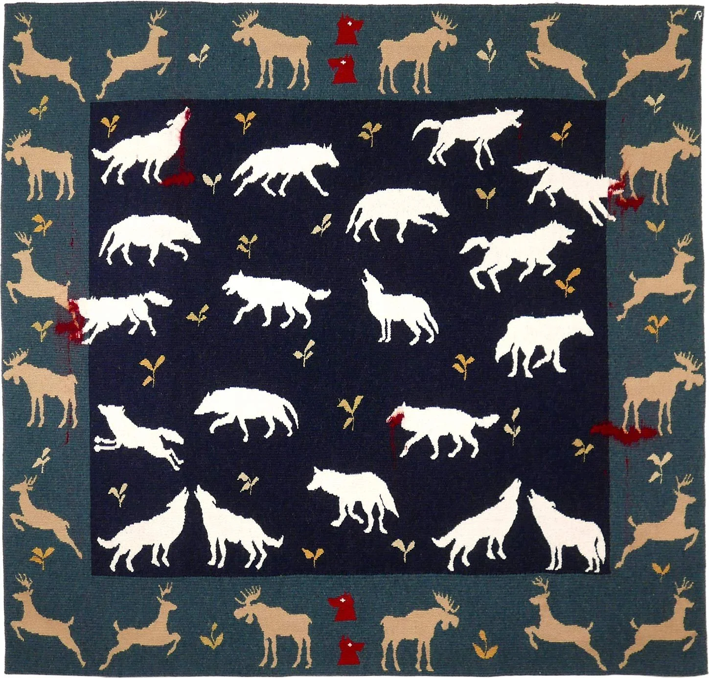 ‘’There Will Be Blood.’’ Dirt. Anger. Terror. Violence. Cruelty. Reality Then and Now. This tapestry was woven during the last months of 2023, inspired by the current situation in the world, political and social events and world history. It is also inspired by scenes from historic hunting tapestries and verdures.