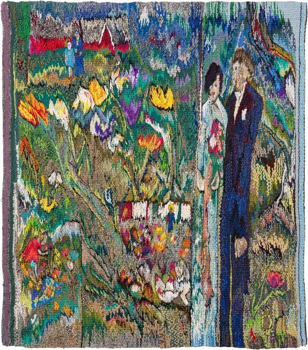 Wedding photo of my mom and dad their future dreams? I often refer to the life and creatures in the beech woods from the Sweden of my childhood. I combine tapestry techniques with a very free use of the old rose path technique. I weave dreams from the country of my childhood. It is a journey to the garden of my childhood, inspired by the country in Skåne, where my mother would often take photos of me in the garden. These are the memories I want to retain in the journey to the brightly coloured flowering garden of childhood.