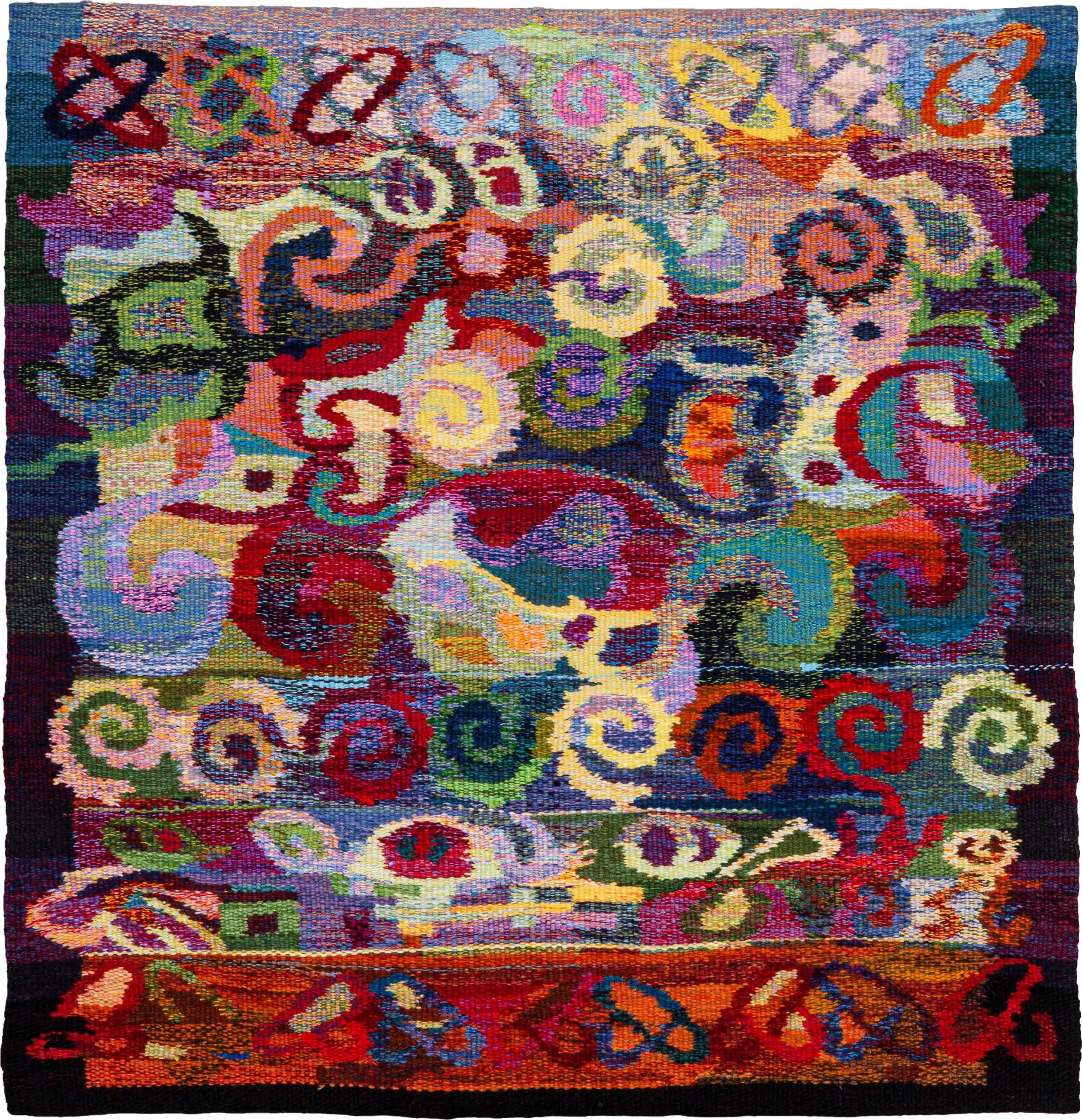 Butterflies are wonderful creatures. Their birth is an almost miraculous metamorphosis. The egg becomes a caterpillar… and eventually the butterfly hatches from the cocoon. And what do we see? A beautiful, light, symmetrical object, which flies from flower to flower. In this way the insect also vitalizes the ecological surroundings, the vegetation. My husband’s grandfather, Otto Donner, wrote a book about his explorations in Central Asia. He reproduced wall decorations of Kyrgyz butterflies which became the book’s illustrations. I have woven some of them into my tapestry.